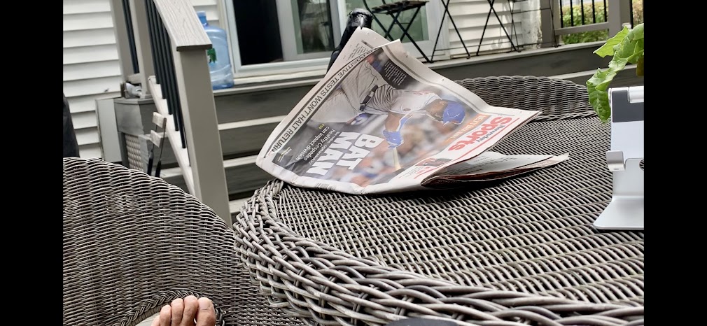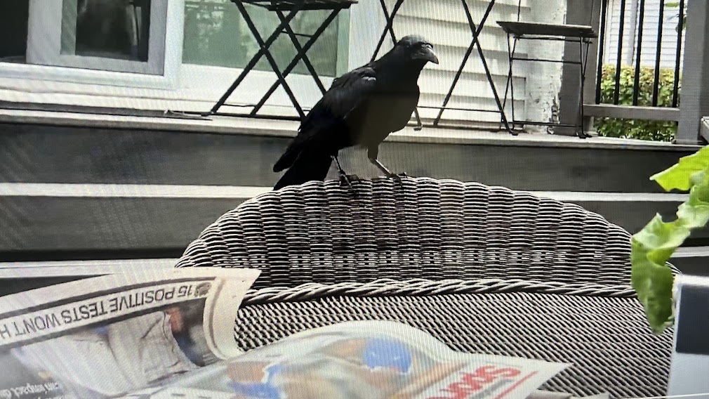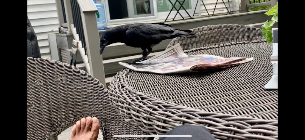 When the crow realized it could not get inside the house, it came down to the deck where I was sitting. The distance separated the two of us because of the wide table. First, it landed on the chair opposite me; still feeling safe, I continued recording the strange bird. As I was thinking what the crow was up to, it had hoped to the chair next to me where I was resting my feet. Eventually, the crow approached me, poked around my newspaper, and looked down at my toes, causing a spark of unease to run down my spine.