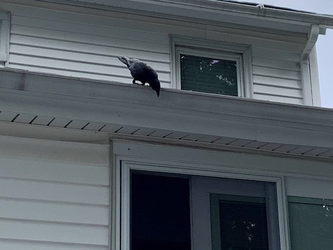 Naturally, I was drawn to the crow’s cawing around our house. A minute had passed, and the crow had flown from the electrical wire from the front of our house to the back. It sat on the gutter right above the sliding patio door. Oddly, it seemed determined to go inside the house.